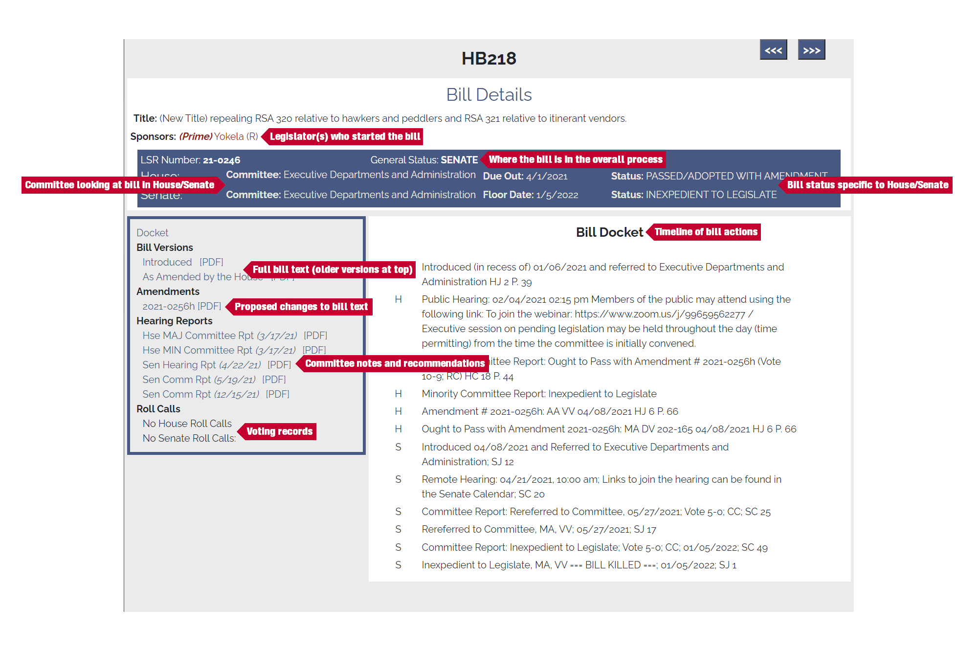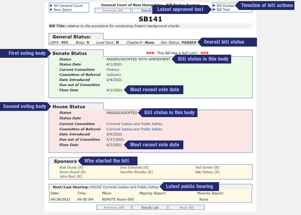 When you search for a bill on the New Hampshire Legislature website, gencourt.state.nh.us, you will find a detailed bill page.