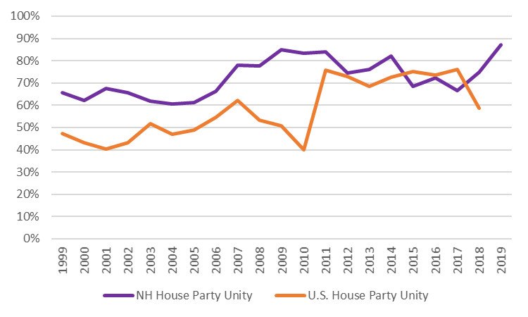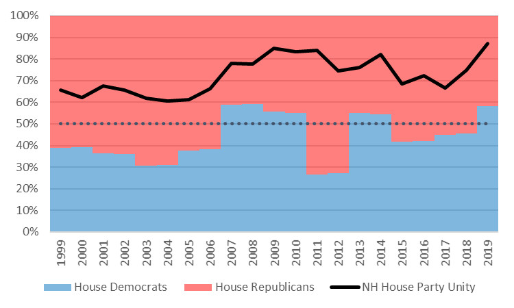 Over the past twenty years in the New Hampshire House of Representatives (1999 through April 4, 2019), party unity has tended to be higher when Democrats hold a majority of seats. On average, party unity was 82% when Democrats held a majority and 68% when Republicans held a majority.