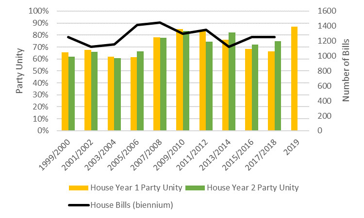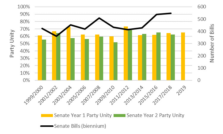There was not any clear relationship between the number of bills and party unity in the Senate, however.