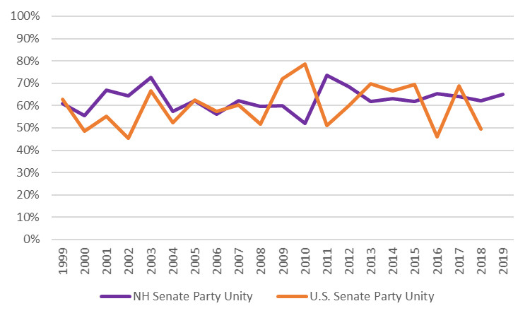 In a recent article Citizens Count explored one measure of partisanship – “party unity” – over the past twenty years of the New Hampshire Legislature. That data generally showed that partisanship is increasing in the New Hampshire House but roughly steady (and lower overall) in the New Hampshire Senate.