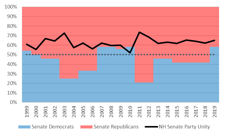 The New Hampshire Senate shows the opposite trends. Over the past twenty years, party unity has tended to be higher when Republicans hold a majority of seats. On average, party unity was 60% when Democrats held a majority and 64% when Republicans held a majority. (The Senate was evenly split in 2000, so that year is excluded from averages.)